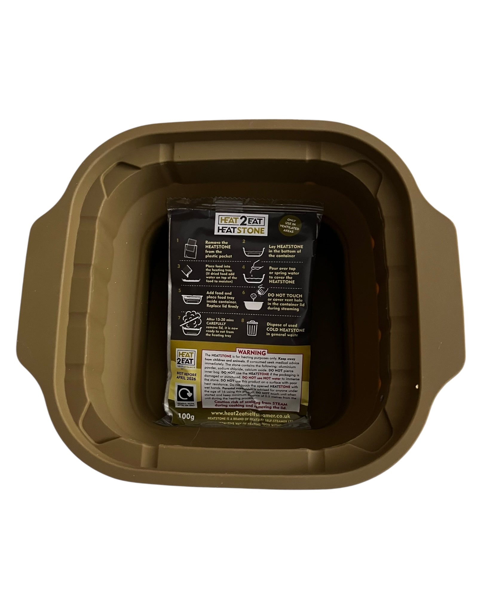 Simply add water. Add your food pouch or food into the tray. Add the heat stone to the water and it activates and causes a mineral reaction that heats the water up and in turn heats the food. Very simple to use in any Condition. We have replacement heat stones available in 1/2/5’s and 10’s.